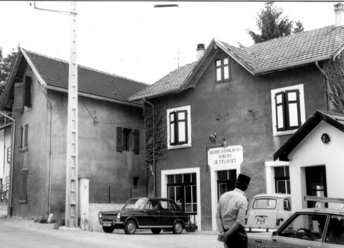 Photographie en noir et blanc du bureau de douane de l'Eluiset. Ce village est stratégique sur la route qui relie Genève à Chambéry. Cette douane dépend de la division de Saint-Julien-en-Genevois.