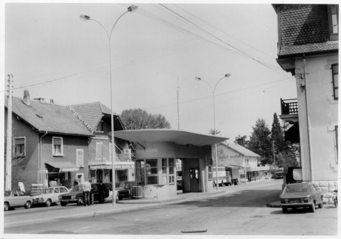 Photographie en noir et blanc de l'aubette centrale de la douane de Perly, à proximité de Saint-Julien-en-Genevois. Cette douane dépend de la division de Saint-Julien-en-Genevois. A proximité d'un véhicule, on distingue un douanier effectuant un contrôle.