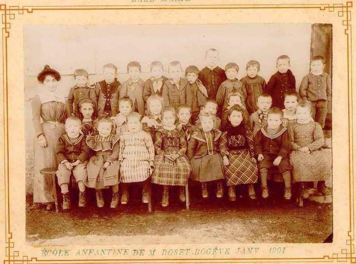 Photographie, en couleurs, représentant la classe de 1901 à Bogève. Cette photographie a été prise à l'école enfantine de M. ROSSET.