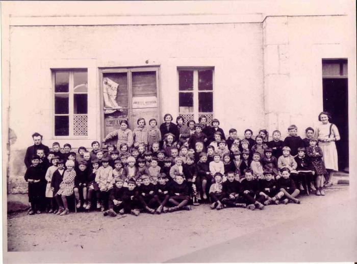 Photographie, en sépia, représentant la classe de 1932 à Bogève. Instituteur : MOSSUZ François