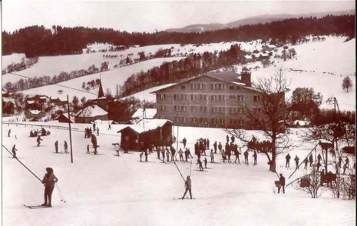 Carte postale, en noir et blanc, représentant le Clos Michaud, en hiver. On aperçoit de nombreux skieurs ainsi qu'un tire-fesses.
