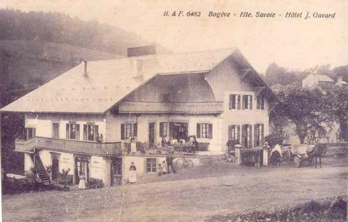 Carte postale, en couleurs, représentant le bâtiment de l'Hôtel Pension Gavard sur la commune de Bogève.