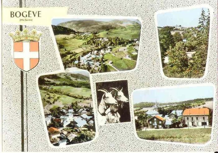Carte postale, en couleurs, représentant la commune de Bogève. Pour cela, elle