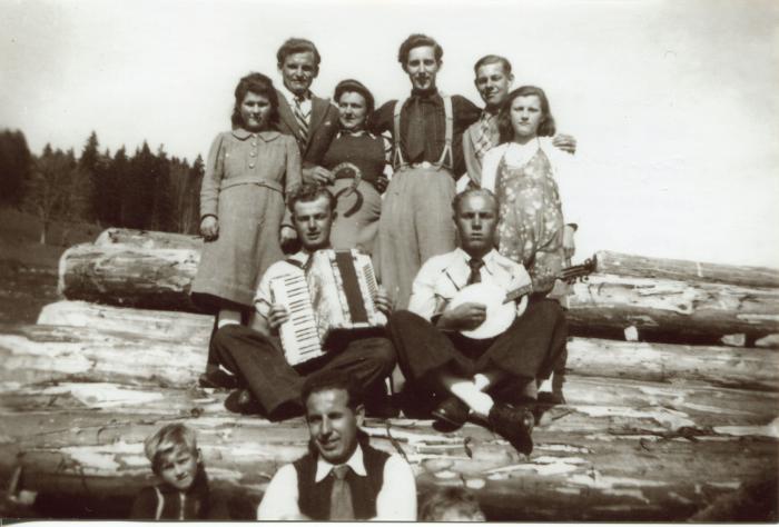 Photographie en noir et blanc des maquisards à Bogève, sur des rondins de bois.