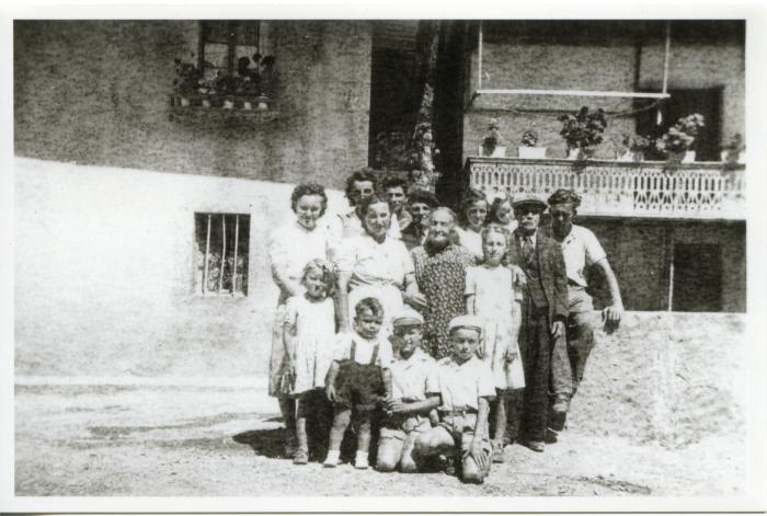 Photographie en noir et blanc des familles BAUD LAVIGNE et GAVARD au Bosson à Bogève (Noms inscrits au recto de la photo). Au fond à droite, un balcon ouvragé.