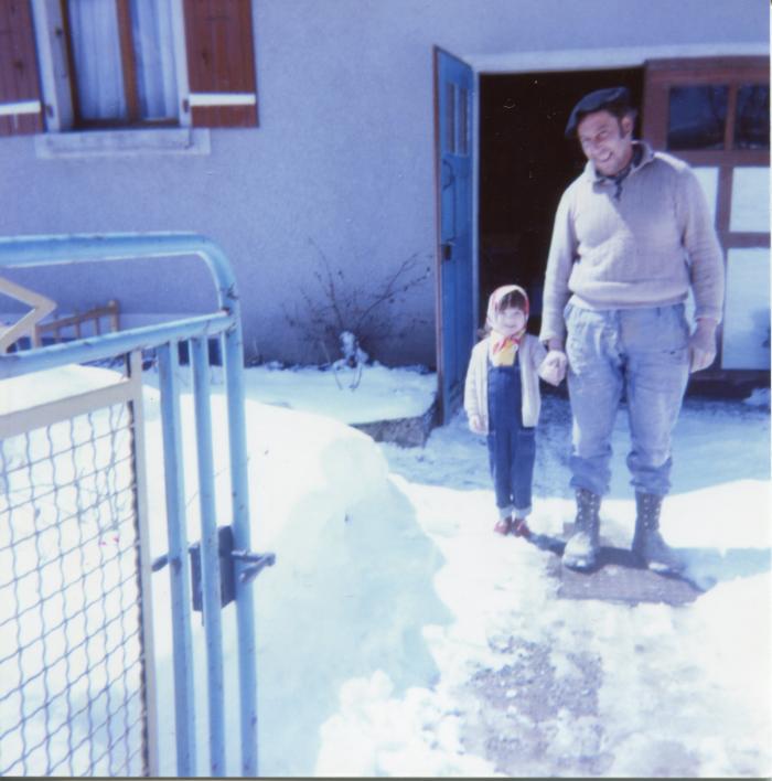 Photographie carrée en couleur de Véronique BOUVIER et Arthur PINGET aux Lavouëts à Bogève, dans la cour d'une maison, dans un décor de neige.