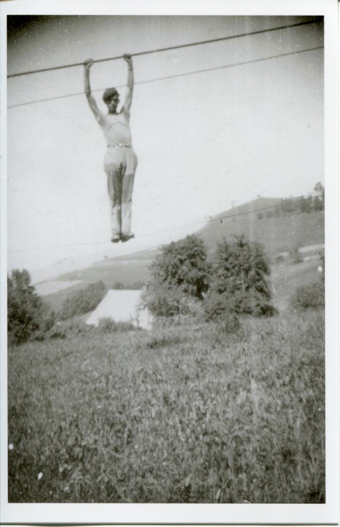 Photographie en noir et blanc de Léon PINGET à La Mouille à Bogève, perché entre deux fils tel un équilibriste.