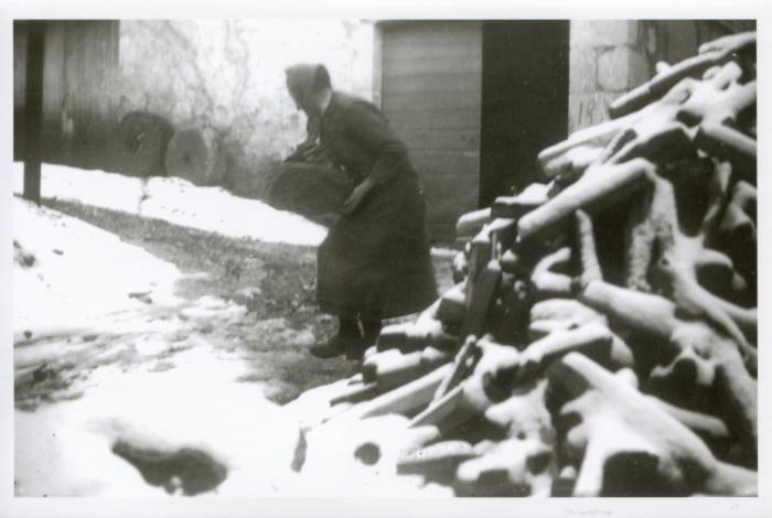 Photographie en noir et blanc de Marie CHARDON à La Mouille à Bogève. Elle porte un foulard et rentre du bois dans un paysage de neige. A gauche, deux meules en pierre sont contre le mur. A droite, un empilement de bois en vrac.