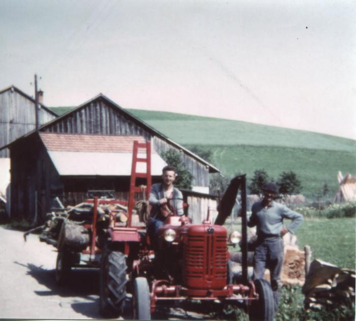 Photographie en couleur de René et Emile « Charlotte » BOUVIER. Le tracteur rouge, complété d'une faucheuse, est attelé à un char à échelle qui contient du bois. Deux maisons à bardage à l'arrière-plan gauche.