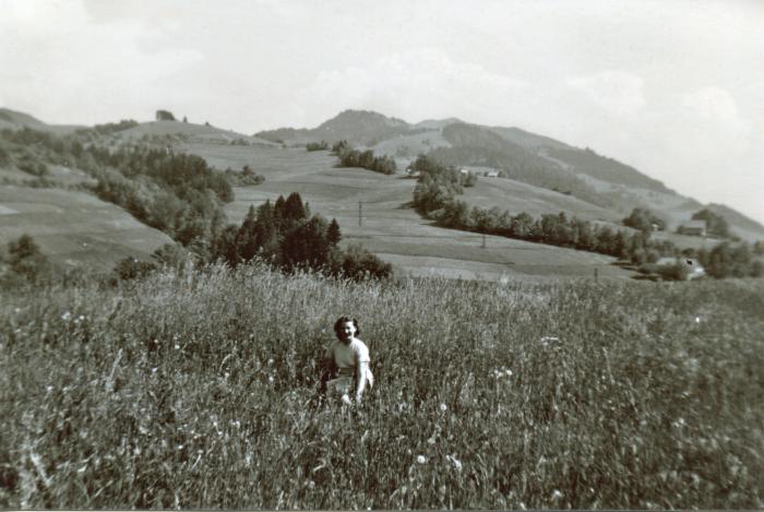 Photographie en noir et blanc d'une femme assise au milieu des hautes herbes à Chorny à Bogève. Il s'agit de la soeur de Robert LIEZOZ.