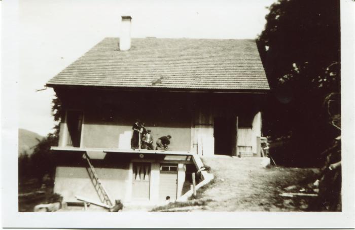 Photographie en noir et blanc de La Grange à Bogève, chez M. CHARDON, en 1954. Jules CHARDON et Pierre BAUD GRASSET travaillent sur le balcon.