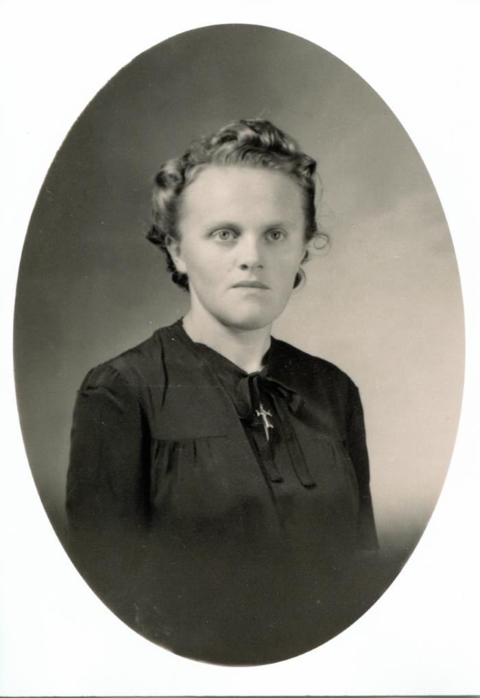 Portrait en noir et blanc, en buste, dans un ovale, de Félicie LE DREAU, née "Tailleur" CHARDON (o 1920).