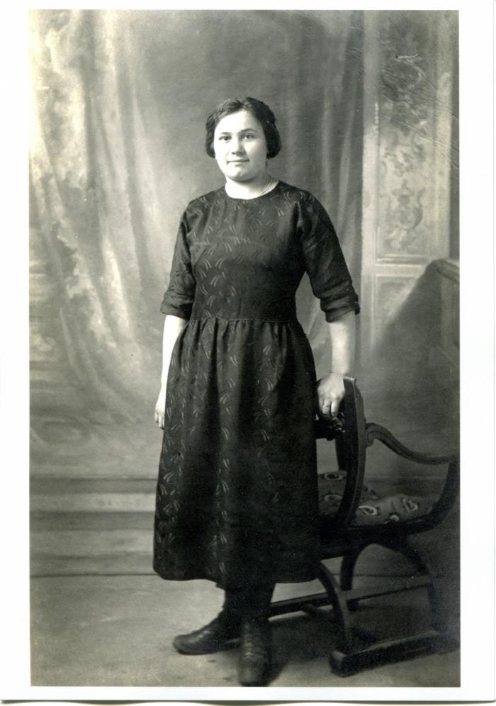 Portrait en noir et blanc, en pied, d'une jeune femme de Bogève.