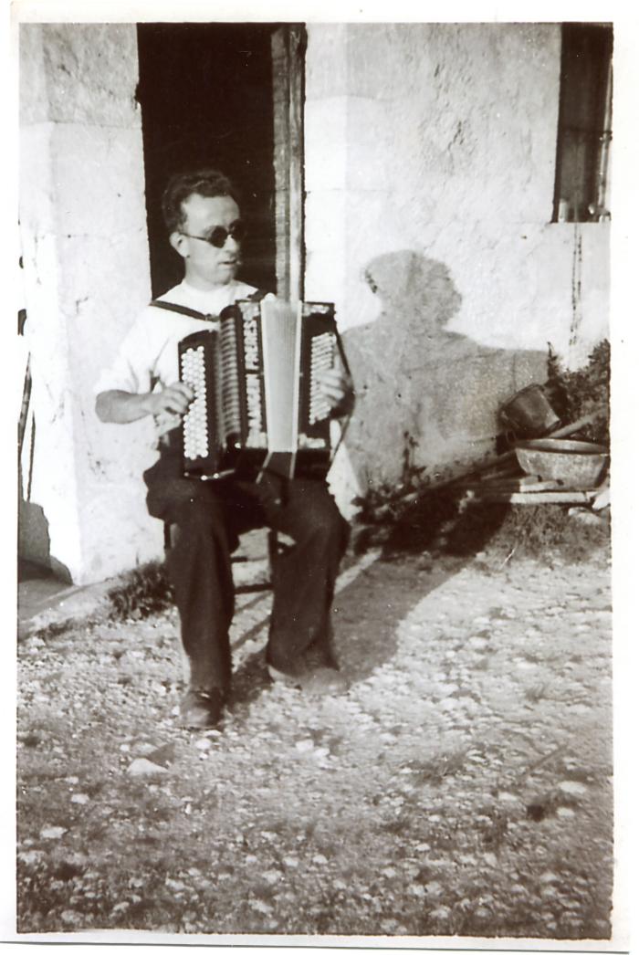 Portrait en noir et blanc de Joseph « Fafois » BAUD GRASSET (1910-1973). Aveugle suite à une blessure de guerre de la Seconde guerre mondiale, il porte des lunettes noires et il joue de l'accordéon, assis.