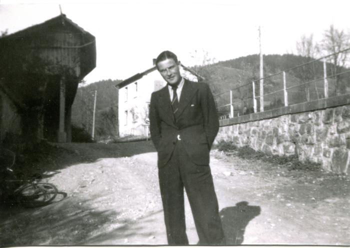 Portrait en noir et blanc, en pied, de François BAUD LAVIGNE dans une rue de Bogève.