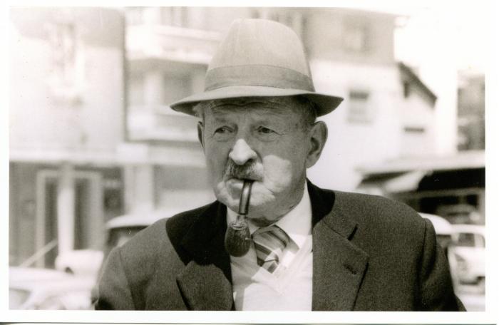 Portrait en noir et blanc, en buste de Félicien PINGET (1904-1996). Il porte un chapeau et il fume la pipe.