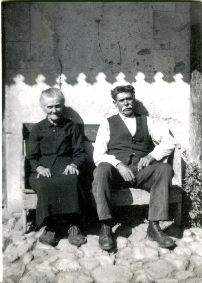 Photographie noir et blanc de SOLIER Aurélie née SAILLET et de SOLIER Émile. Ils sont âgés et assis sur un banc devant une maison.