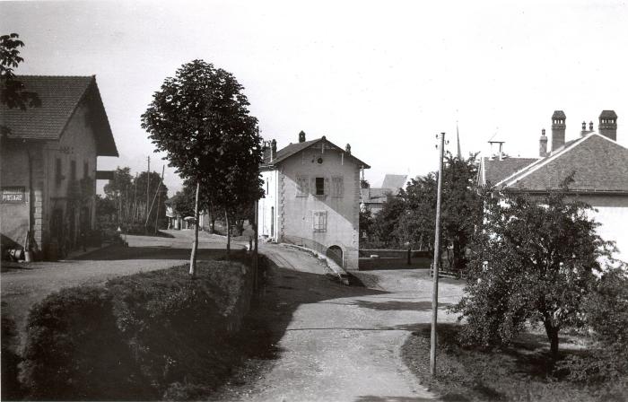 Photographie noir et blanc de quelques maisons et deux routes à Bogève.