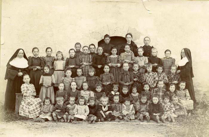 Photographie en noir et blanc représentant une photo de classe à Bonne. L'enseignement était assuré par deux religieuses.