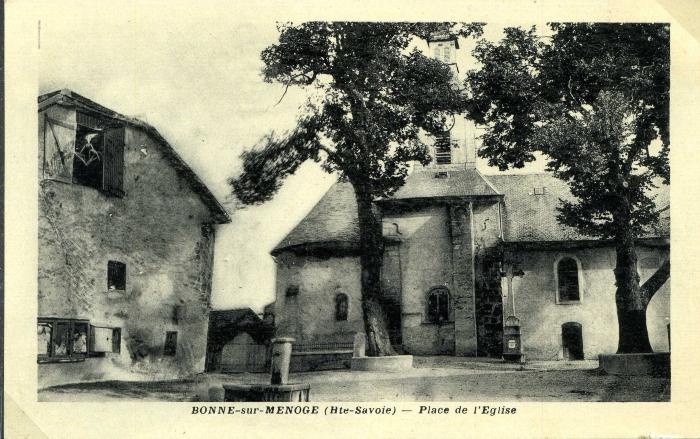 Carte postale en noir et blanc représentant la place de l'église de Bonne. Cette dernière est sous le vocable de Saint-Nicolas.