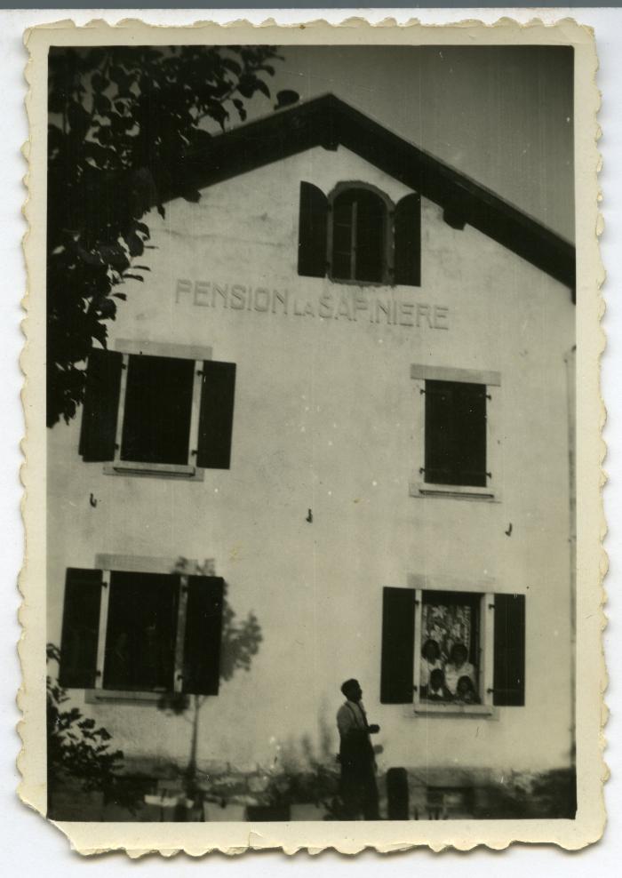 Photographie de petit format et à bords dentelés, de la pension La Sapinière, prise en août 1932. Quelques pensionnaires posent à l'une des fenêtres du rez-de-chaussée. Au pignon de la façade est peinte l'enseigne "PENSION LA SAPINIERE". Celle-ci se situait au Chef-Lieu de Fillinges. Restaurée, elle appartient à la mairie et elle renferme aujourd'hui des locaux communaux. Cette image est liée au témoignage audio de Madame DUMONT DAYOT Andrée.