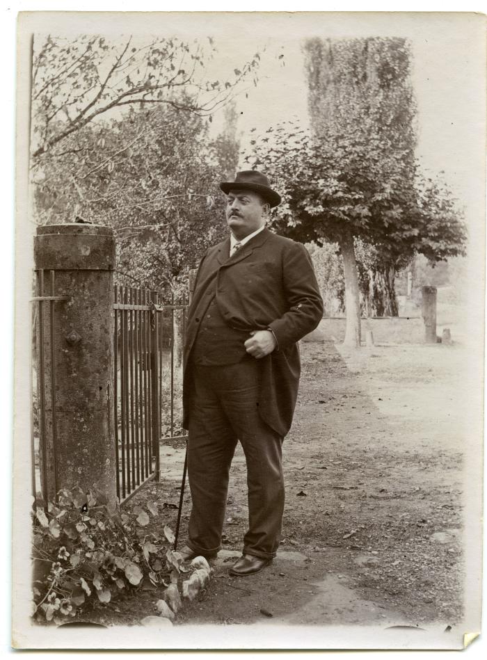 Portrait d'Alfred Gaulard devant la grille du jardin Chez Bosson à Fillinges, chez le docteur Adrien Bonnefoy. Il est le fondateur de la Séquanaise.
