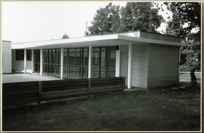 Photographie en noir et blanc représentant le centre de la petite enfance à Gaillard, dessiné par l'architecte Guy DEGRANDCHAMPS et situé rue du Martinet.
