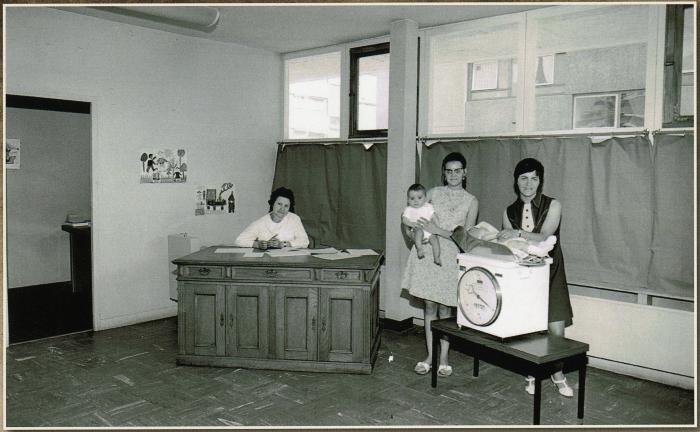 Photographie représentant la pesée des nourissons au centre social de Gaillard, assise derrière le bureau, l'assistante sociale Mme BERNAZ.
