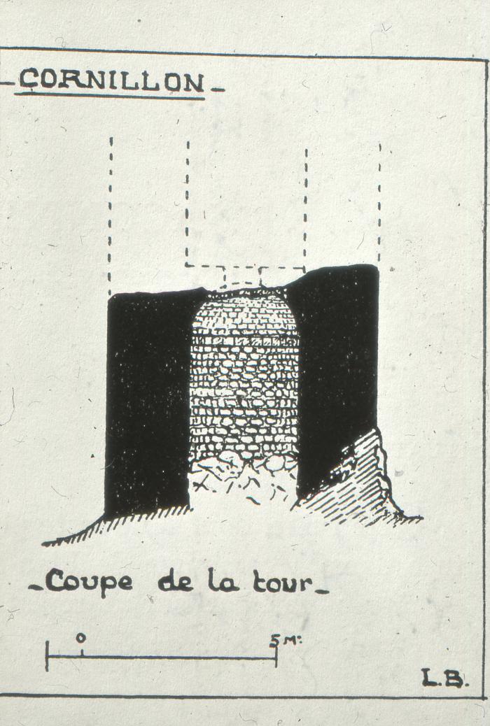 Saint-Laurent, château de Cornillon, coupe de la tour, dessin. Actuellement il reste une partie d'un donjon roman (supposé du début du XIIe siècle) quadrangulaire légèrement losangé et qui était à usage de logis. Ce bâtiment fut accolé, vers le milieu du XIIIe siècle d'un donjon circulaire d'un peu moins de 8m de diamètre à la maçonnerie soigneusement appareillée.