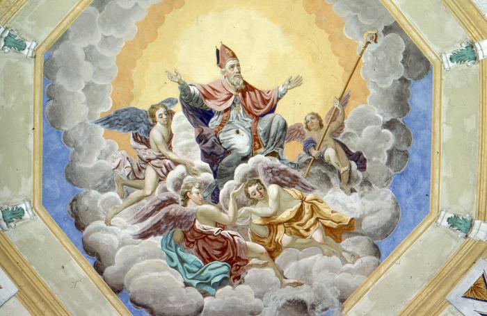 Saint-Nicolas de Véroce, voûte peinte de l'église. Sa simplicité et sa sobriété tranchent avec un intérieur éclatant de couleur et de beauté. Une de ses particularités se trouve dans le décor de sa voûte de style néoclassique, exécuté par les frères AVONDO en 1856. On peut y admirer le fameux « bleu de Saint-Nicolas ».