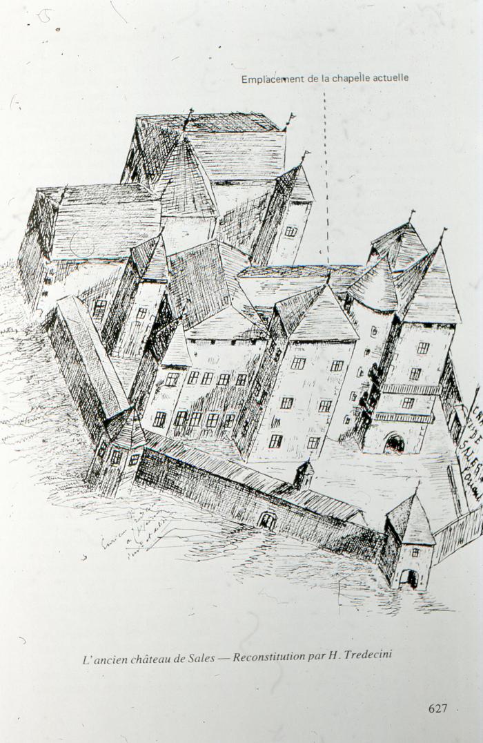 Thorens: l'ancien château de Sales. Reconstitution par H. TREDECINI, gravure