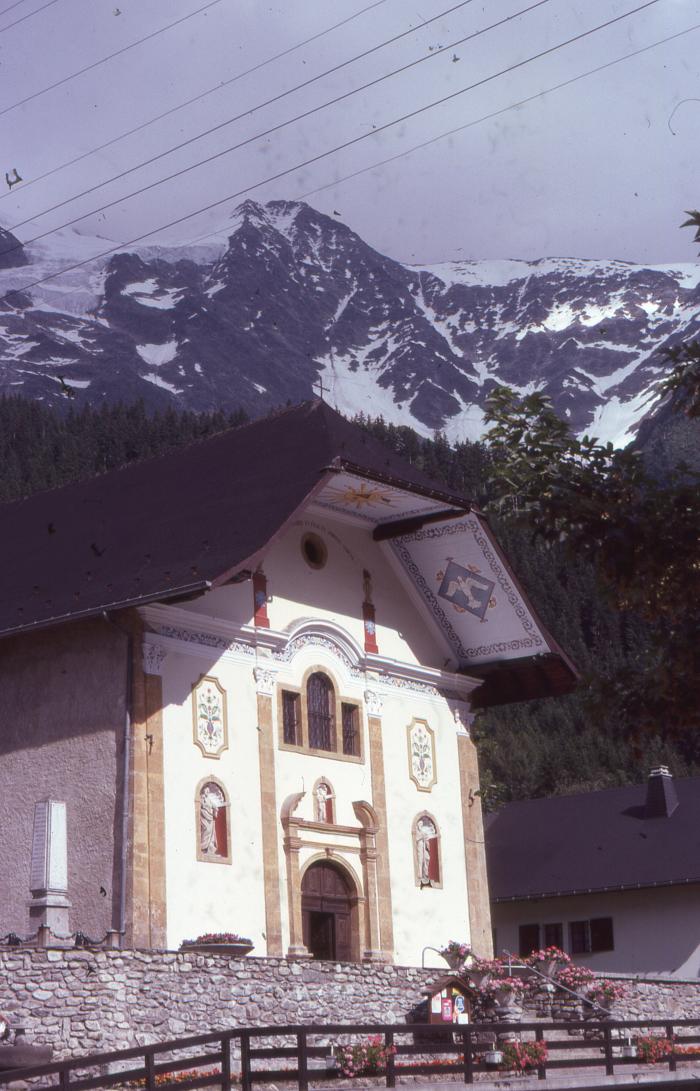Façade de l'église de la Sainte-Trinité des Contamines-Montjoie est une église savoyarde baroque construite en 1759.