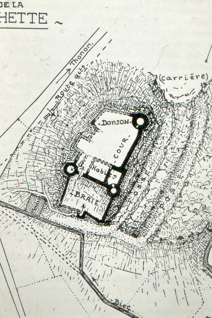 Le château est construit peu après 1250 par Gérald de CERVENS. La Rochette est un excellent exemple des châteaux forts de la Savoie du XIIIe siècle. Plan du château par BLONDEL