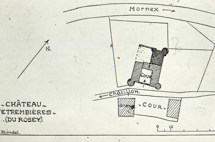 Plan du château d'Etrembières établi par BLONDEL. Le château d'Étrembières est une ancienne maison forte, de la fin du XIIIe siècle ou du début du XIVe siècle, remanié aux XVe et XVIe siècles et restauré au XXe siècle