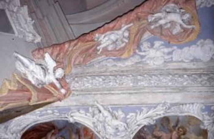 Thonon, détails du plafond de l'église de Saint-Hippolyte. La voûte, abondamment stuquée dans le style italien, est l'oeuvre des stucateurs tessinois B. PANDOLPH et J.F. SILVA