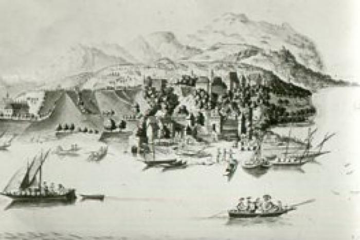 Thonon, vue de la ville vers 1820, selon ESCUYER. On y voit des « naux » ou bateaux à voiles de l'époque