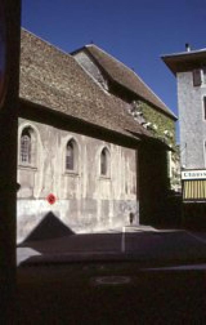 Originellement du XIIe siècle, elle est construite au-dessus d'une crypte romane au XIVe siècle et a été remaniée au XVIIe siècle dans le style baroque savoyard