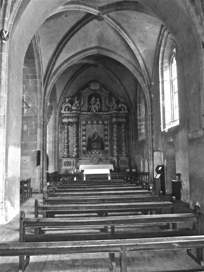 l'église Saint-Maurice à Annecy. Sa construction a été voulue en 1422 par le Cardinal de BROGNY. Au départ, elle devait être une simple chapelle. Mais son édification devenait de plus en plus grosse, avec des chapelles latérales. Ici nous voyons le retable du rosaire avec la Vierge à l'enfant dans une chapelle latérale. Photographie en noir et blanc.