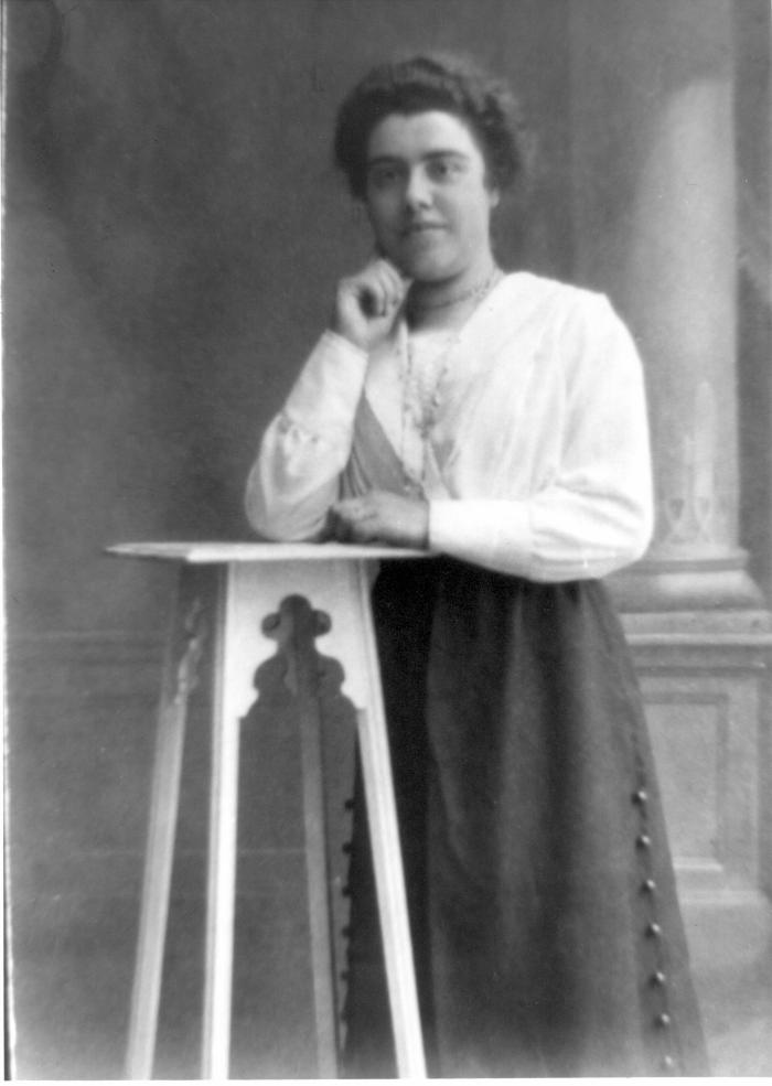 Photographie de Céline GENOUD née DUCROT. Elle porte un chemisier blanc, une jupe noire rehaussée de boutons de chaque côté. Elle est coiffée d'un chignon. Elle est adossée côté droit sur un guéridon. Reculfou, Habère-Poche.