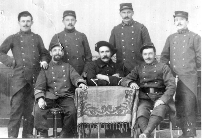 Photographie en noir et blanc (légèrement déchirée) d'un groupe d'hommes intitulée sous les drapeaux. Ils sont tous en habit militaire.
