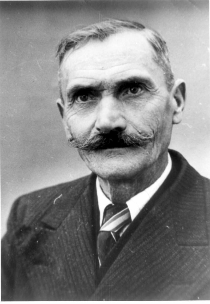 Portrait de François MOUVILLAT. Il porte la moustache, une veste de costume ainsi que la cravate. Il est le beau-frère de Diozé à Mariè. Travail de documentation réalisé par le GAER, Groupe d'Action pour l'Environnement Rural, la qualité de vie, l'animation à Habère-Poche.