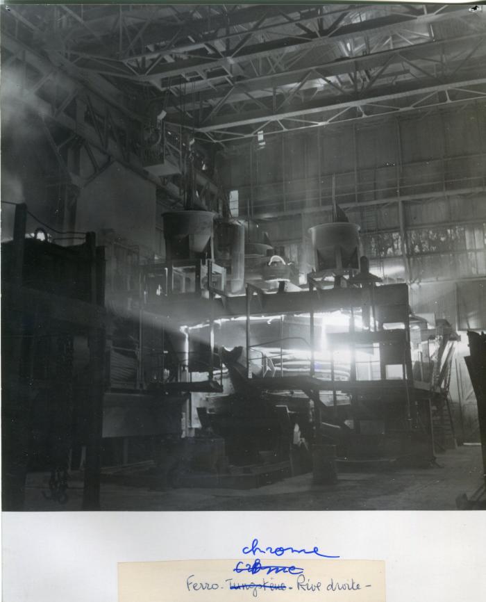 Photographie en noir et blanc représentant le Ferro-Tungstène.;sur un cliché fourni par A. Magliocco la mention "ferro tungstène _ rive droite" est barrée au profit de "ferro-chrome _ rive droite"