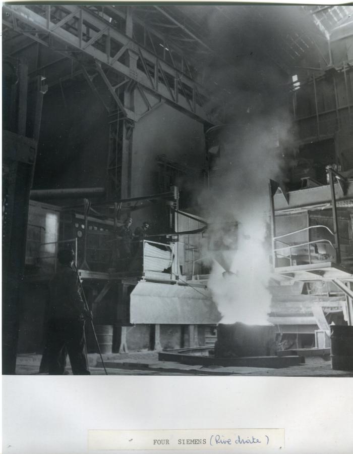 Photographie en noir et blanc représentant le four Siemens en fonctionnement dans un atelier de l'usine du Giffre. 3 ouvriers sont présents sur le cliché.