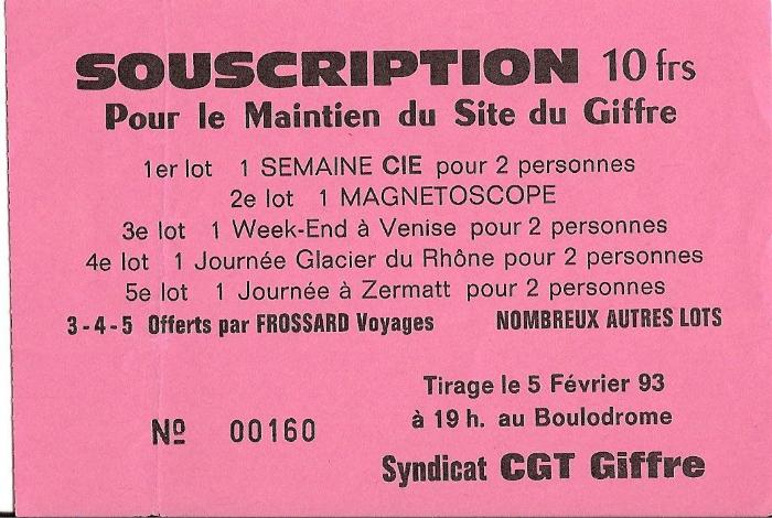 Bulletin symbolique de souscription pour le maintien de l'usine du Giffre par la CGT. Plusieurs lots étaient à gagner.