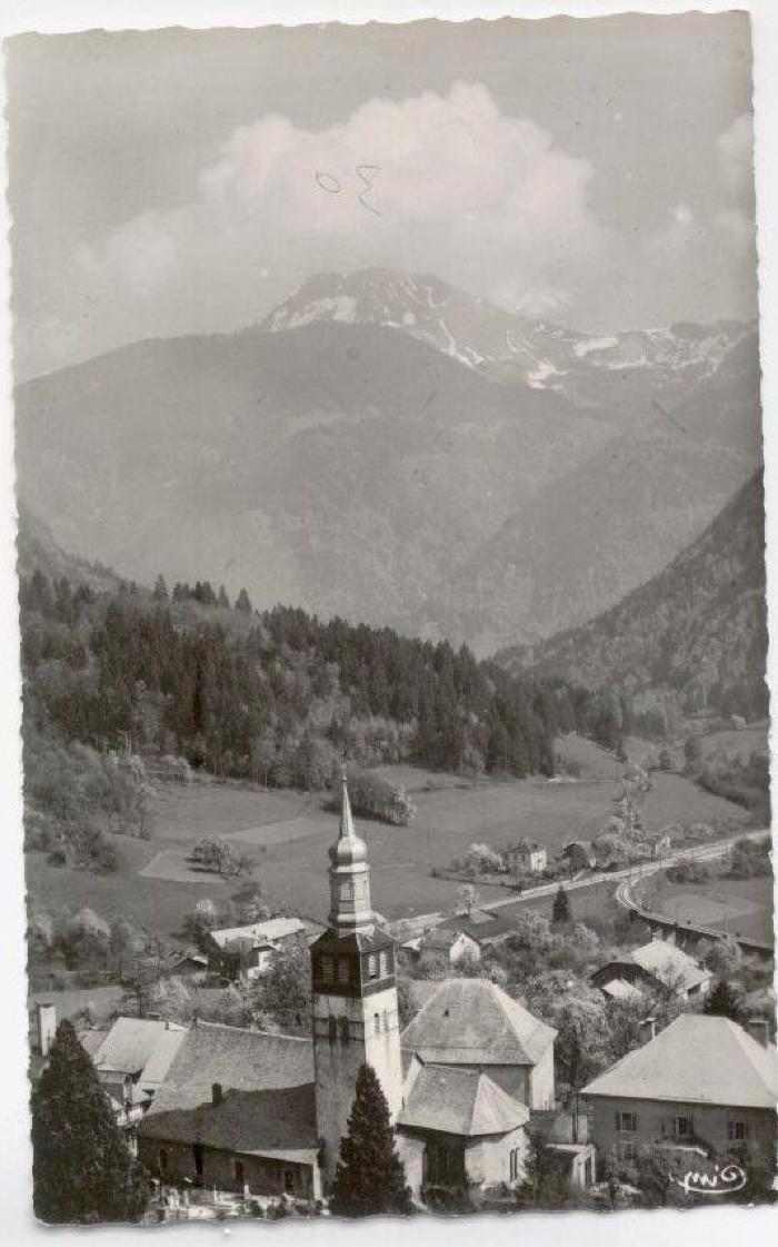 Carte postale ancienne montrant le clocher et l'église de Mieussy.