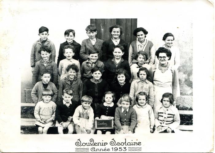 Photographie en noir et blanc de la classe de l'école de Laitraz, 1953.