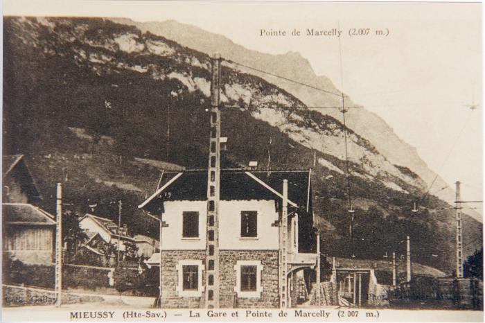 Carte postale ancienne, sépia, montrant la gare de Mieussy. En arrière-plan, on distingue le pic du Marcelly.
