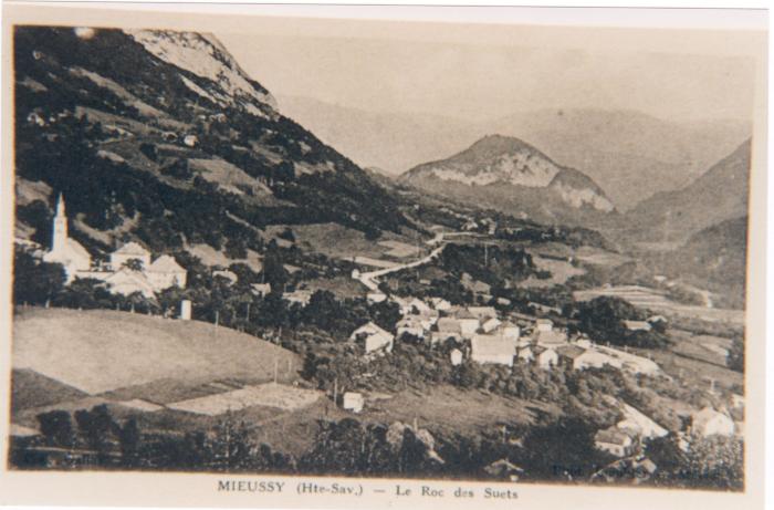 Carte postale ancienne, sépia, montrant une vue générale de Mieussy et, en arrière-plan, le Roc des Suets. On distingue l'église.