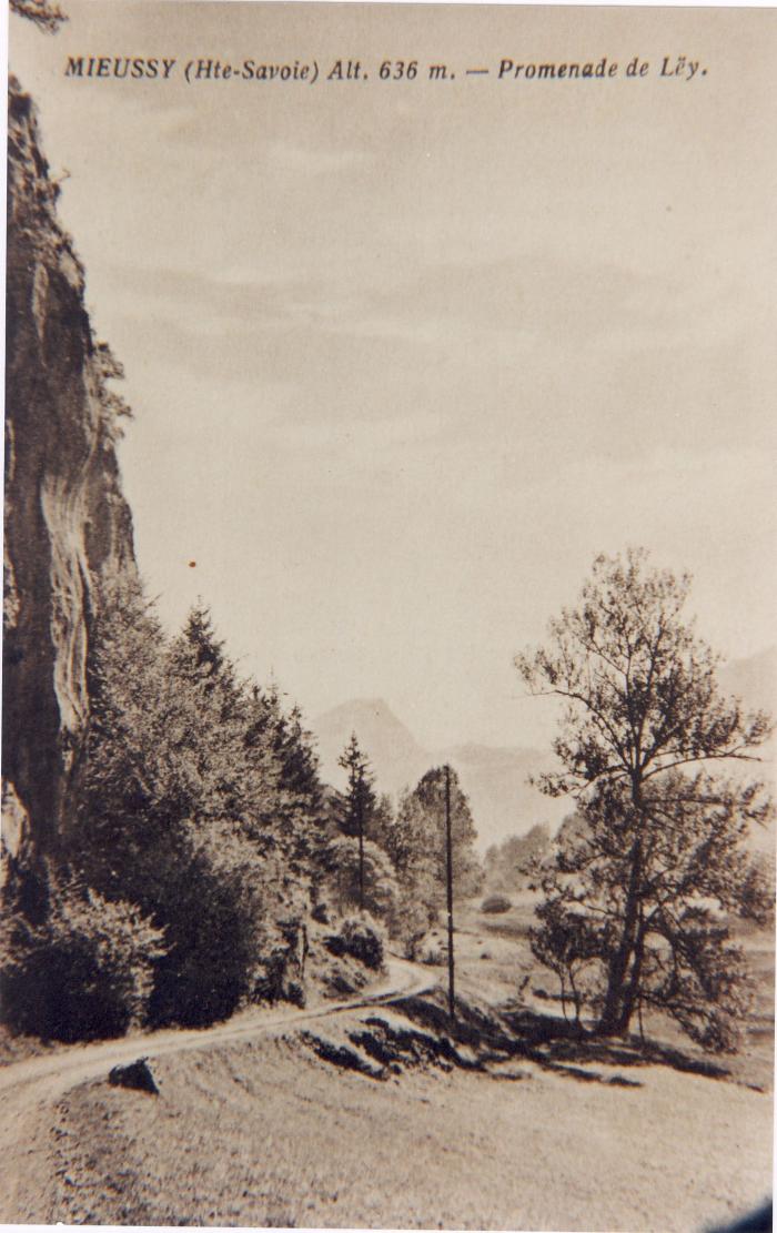 Carte postale ancienne, sépia, montrant la promenade de Lëy, à Mieussy.