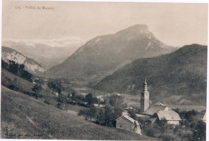 Carte postale ancienne, sépia, montrant la vallée de Mieussy. On distingue l'église.